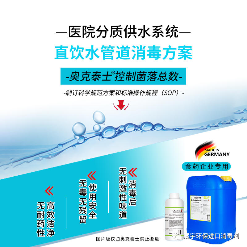 奥克泰士消毒剂,D-50/500(过氧化氢银离子)是一种专业的生态型消毒剂,对生物膜、细菌、真菌、病毒具有深度效力,能够有效解决水系统的耗氧量(有机物污染)和菌落总数超标等顽固性问题,且其消毒后没有刺激性味道,无色无味,食品级生态安全无毒无残留,很好的解决客户的痛点问题。是饮用水系统消毒的理想选择。